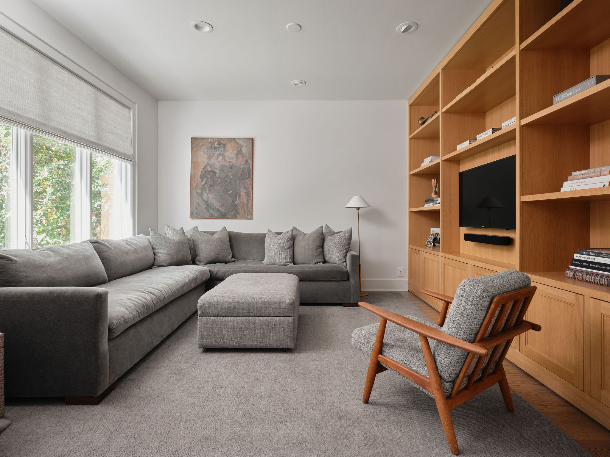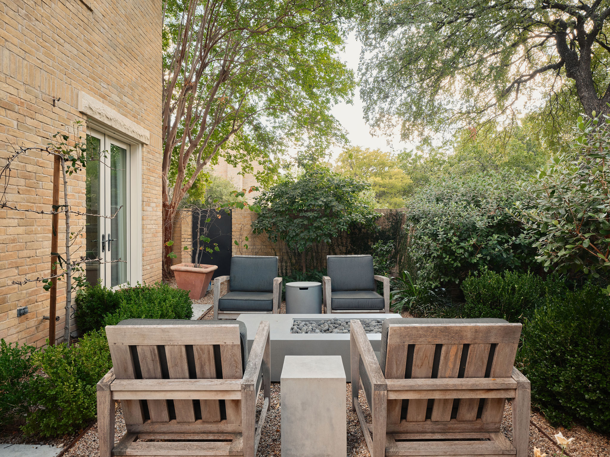 Custom built-in oak shelving highlights the den, while the living room centers around an elegant fireplace—perfect for intimate gatherings. Expansive windows frame views of the gated courtyard, creating a beautiful private retreat. Outdoor living is elevated with lush greenery and seating area surrounding a cozy fire pit.
